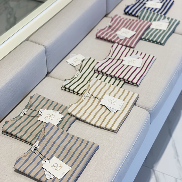 ✔️ 생지원단에 염색입히는 후염원단이아닌 수피마원사에 먼저 색을입혀 스트라이프패턴으로
